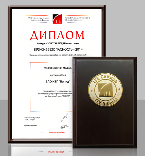 Награда: Малая золотая медаль в номинации "Научные и технические разработки в области системы безопасности" - за разработку и производство "Комплекса средств речевого оповещения на базе приборов "РУПОР"