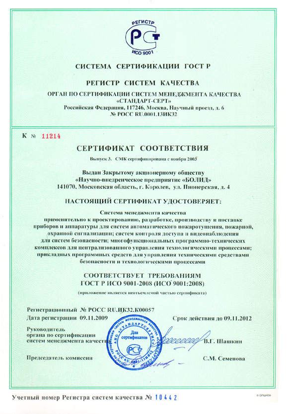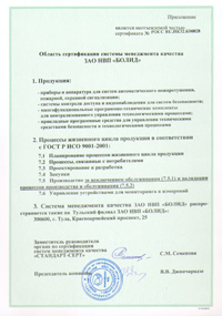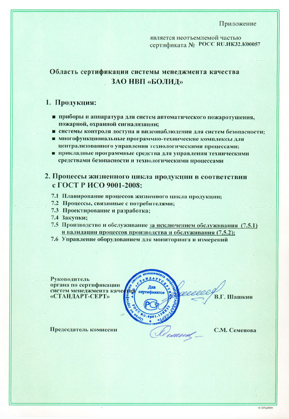 | Сертификат соответствия | Область сертификации системы менеджмента качества ЗАО НВП "Болид" |