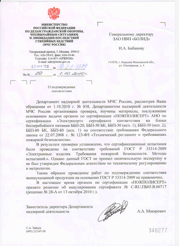 Особый интерес вызвал сертификат соответствия на представленные источники питания № С-RU.ПБ05.В.00717 который подтверждал соответствие блоков питания требованиям Федерального закона №123-ФЗ в рамках неизвестного ГОСТ Р 53314-2009!