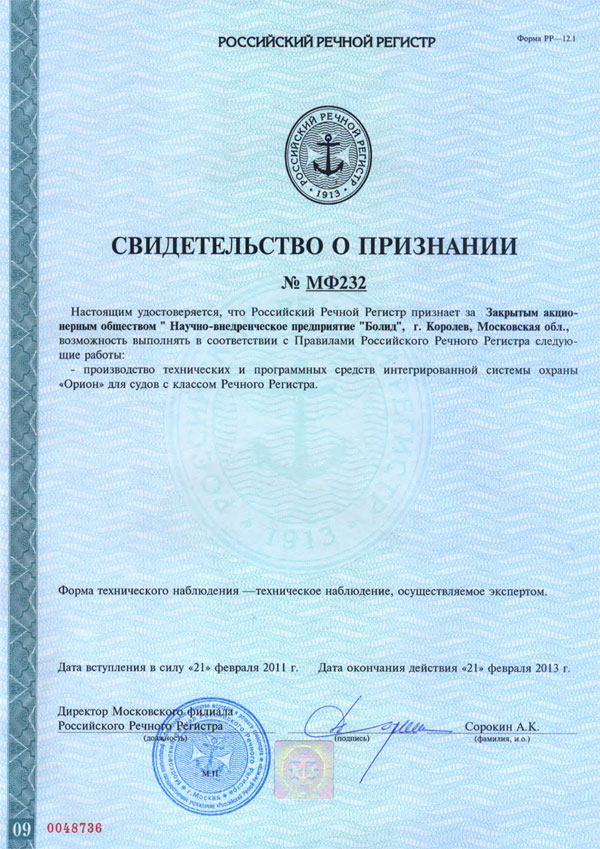 Свидетельство о признании удостоверяет, что Российский Речной Регистр признает за ЗАО НВП "Болид" возможность выполнять качественно и на должном техническом уровне в соответствии с Правилами Российского Речного Регистра следующие работы: