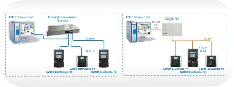 "С2000-BIOAccess-F4" и "С2000-BIOAccess-F8" - предназначены для совместной работой с АРМ "Орион Про" для организации системы контроля и управления доступом (СКУД) по биометрическим идентификаторам – отпечаткам пальцев.