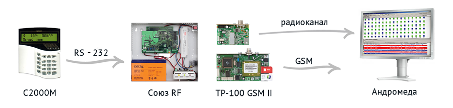 | Ключевым устройством интеграции служит преобразователь форматов — Союз RF. Пульт контроля и управления "С2000М" подключается к "Союз RF" через последовательный порт RS-232 и передает ему свои сообщения в цифровом виде. Это позволяет передавать информацию из охранно-пожарной системы объекта в ЦСМ "Андромеда" по радиоканалу и GSM. |