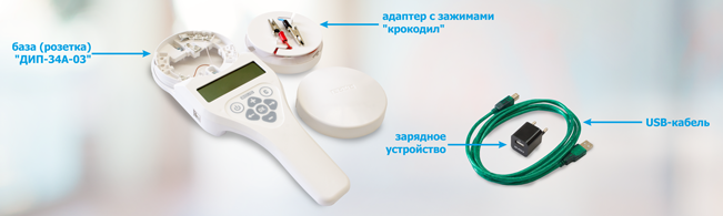 Для программирования дымовых, тепловых и газовых пожарных извещателей программатор оснащен базой (розеткой) "ДИП-34А-03", а для программирования других типов извещателей в комплект входит адаптер с зажимами "крокодил", который устанавливается в розетку "ДИП-34А-03".