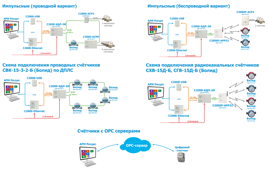 Схемы подключения счётчиков к АСКУЭ "Ресурс":