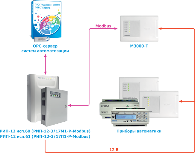 Резервированные источники питания РИП-12 исп.60 (РИП-12-3/17М1-Р-Modbus) и РИП-12 исп.61(РИП-12-3/17П1-Р-Modbus) предназначены для работы в составе систем автоматизации и диспетчеризации для питания приборов контроля и управления, датчиков, контроллера "М3000-Т Инсат" и другого инженерного оборудования. Управление и контроль РИП осуществляется по интерфейсу RS-485 по протоколу Modbus RTU.