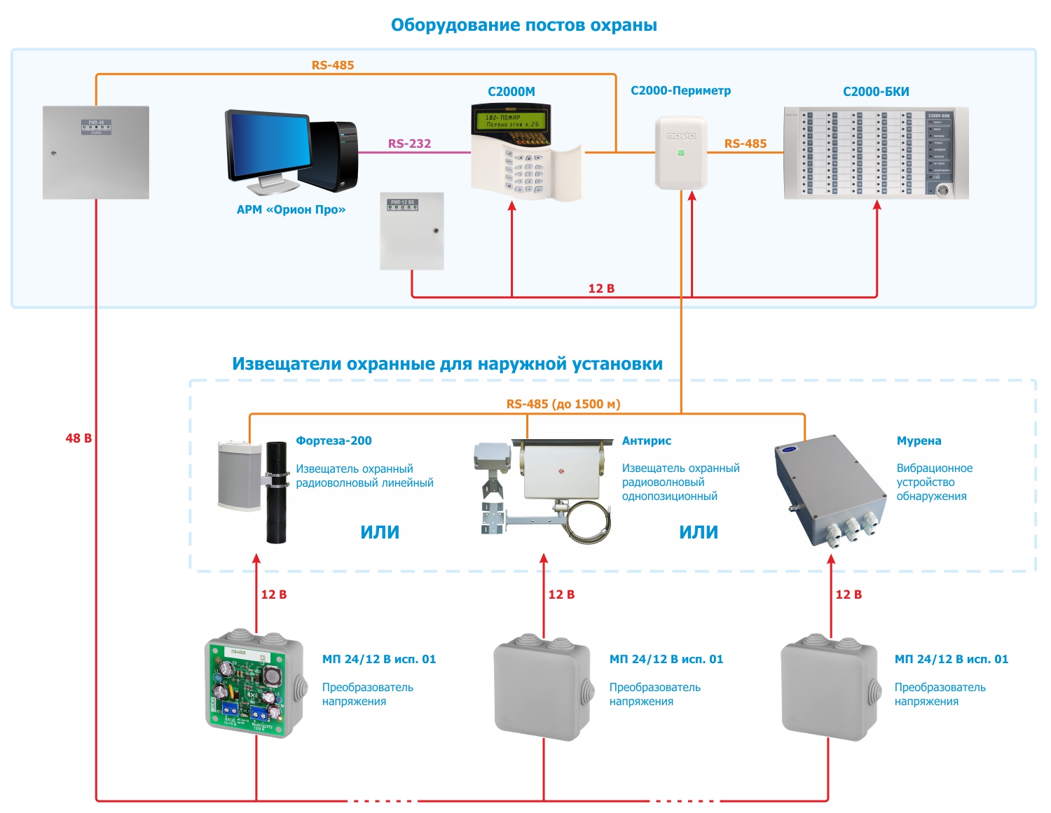 В ИСО "Орион" РИП-48 исп.01 (РИП-48-4/17М3-Р-RS) взаимодействует с пультом "С2000М" или АРМ "Орион Про", передает данные и получает команды управления по интерфейсу RS-485.