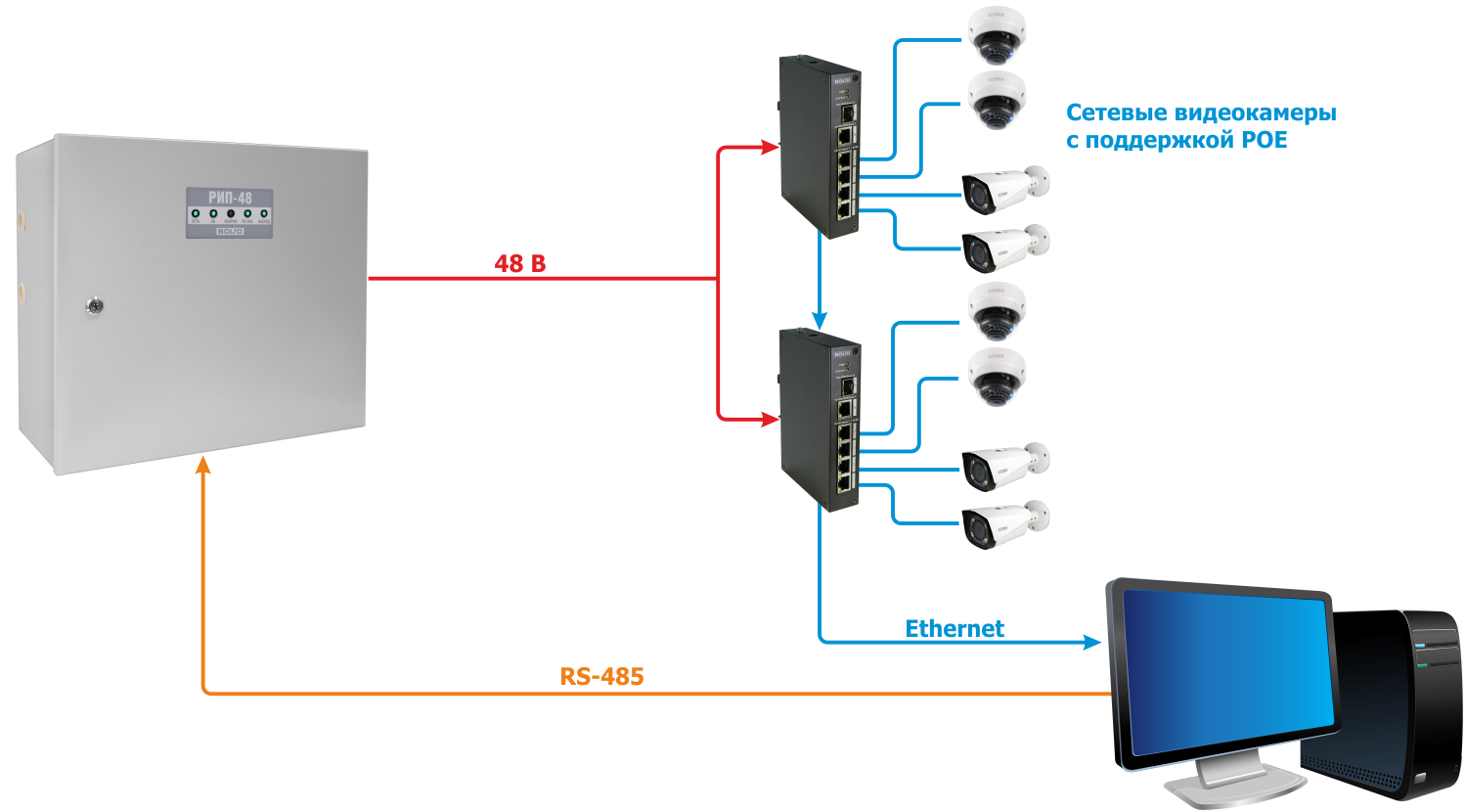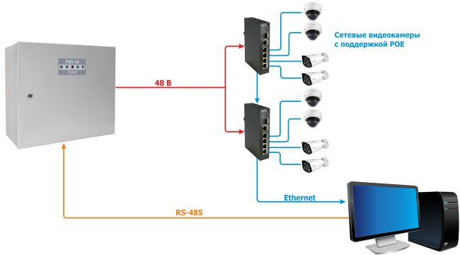 Резервированные источники питания РИП-48 исп.01 (РИП-48-4/17М3-Р-RS) предназначены для резервированного питания систем видеонаблюдения: сетевых регистраторов (типа RGI), коммутаторов (типа SW), устройств на основе технологии POE, а также для работы в составе ИСО "Орион" для питания извещателей, приборов ОПС, СКУД и пожарной автоматики на удаленных объектах.