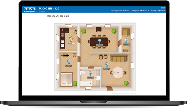 «М3000-ВВ-1020» имеет возможность отображать состояние входов и выходов, а также управлять выходами и изменять конфигурацию через веб-интерфейс по сети Wi-Fi. Специальное ПО при этом не требуется. Веб-интерфейс позволяет загружать подложку плана помещения и расставлять на нем интерактивные управляемые элементы.