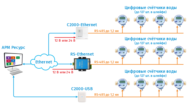 Схема подключения счётчиков воды «BOLID» СВ-15-3-2-Б4 в систему АСКУЭ «Ресурс»: