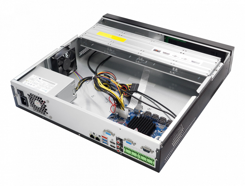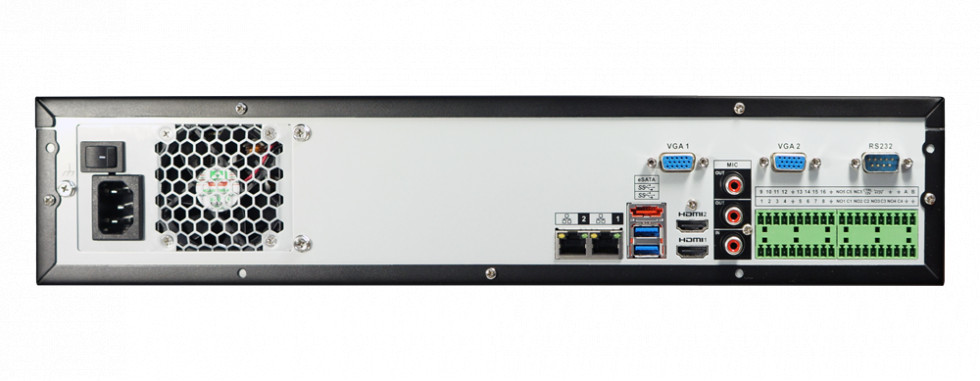 16 каналов для сетевых камер, 8 портов для HDD, 2 HDMI порта для подключения мониторов, 2 Ethernet порта, 16 тревожных входов. Рекомендуется для средних и крупных объектов с высокими требованиями к длительности хранения видеоархива