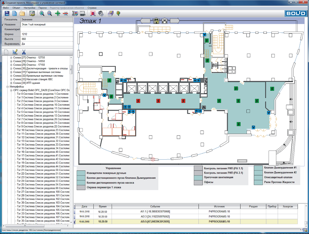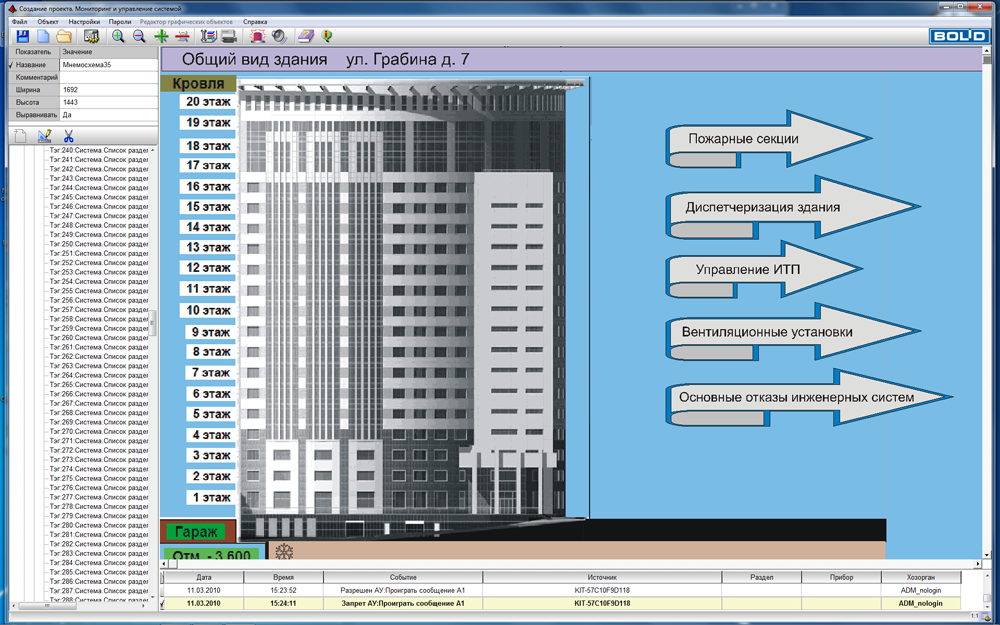 - создание и прорисовка на мнемосхемах элементов-ссылок на выбранные мнемосхемы системы, формирование списков ссылок перехода с этажей здания на конкретные планы и мнемосхемы, перехода с карты области на конкретные здания и так далее;
