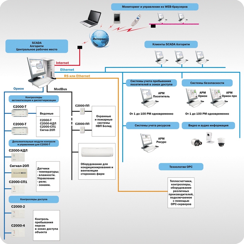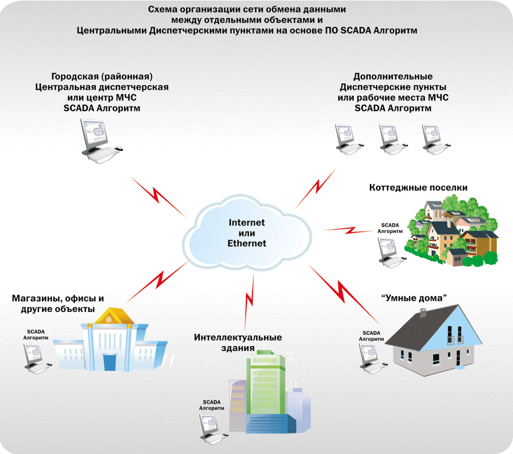 - SCADA Алгоритм позволяет создать распределенную сеть клиентских рабочих мест различного назначения по опросу контроллеров, получения данных от интегрируемых систем, мониторингу ситуации и управления объектом. Вся получаемая информация может транслироваться по сети на рабочее место-диспетчерский пункт по сети Ethernet или Internet без ограничения на тип соединения (например по модему со скоростью от 50Кбит/сек);