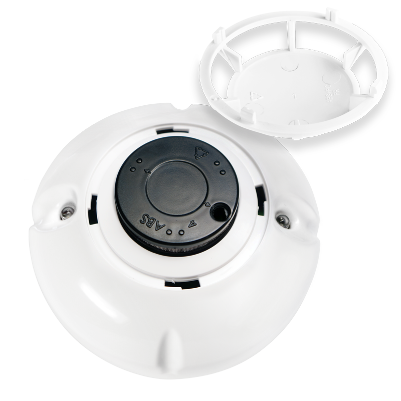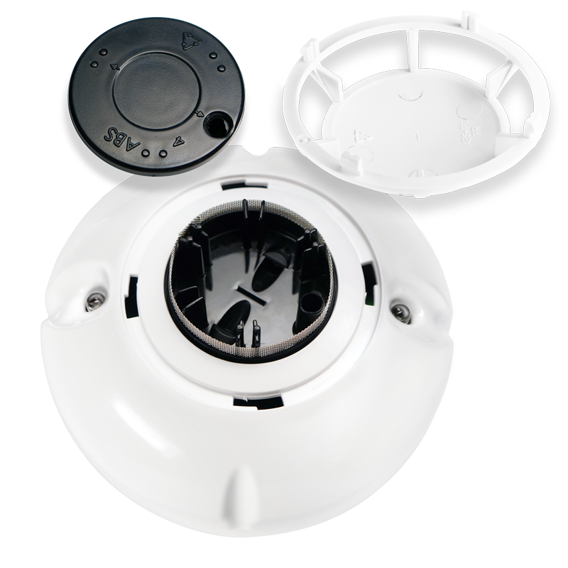 • Конструкция позволяет проверить и почистить дымовую камеру от пыли, не разбирая корпус извещателя. Достаточно скрутить декоративный элемент корпуса, защищающий камеру