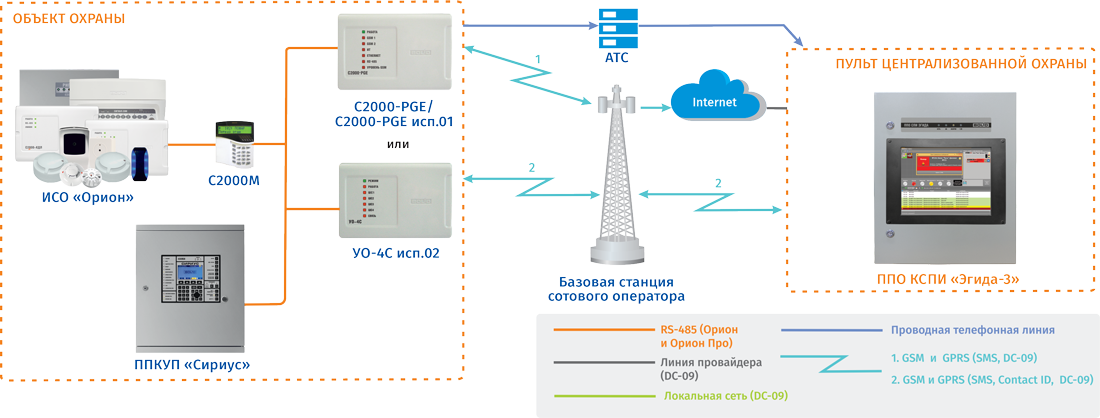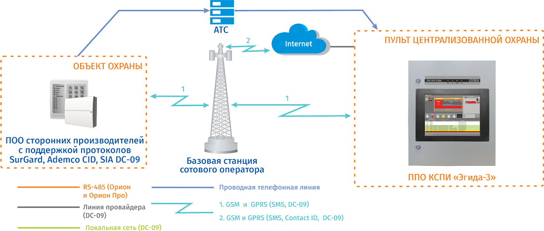 Пакетная передача данных от приборов оконечных объектовых возможна по каналам GPRS (мобильный интернет) и локальной сети на защищённый сетевой коммутатор SW08 при условии подключения ППО КСПИ Эгида к локальной сети со статическим сетевым адресом. В качестве резервного или основного канала может применяться способ передачи по каналу GSM SMS на пультовые устройства, входящие в состав ППО КСПИ «Эгида». Для объектов, где невозможно или нецелесообразно применение сотовой связи, оптоволоконной или локальной сети, можно использовать коммутируемую телефонную линию. Приём извещений осуществляется пультовым модулем УОП-3 GSM, подключенным к выделенной телефонной линии.