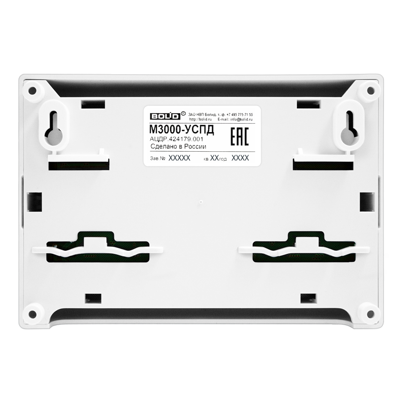 Питание прибора осуществляется от внешнего источника питания постоянного тока с номинальным напряжением 12В или 24В. При использовании резервированных источников питания «РИП-12» или «РИП-24» исп. 50 и выше производства НВП «Болид» реализуется контроль наличия питания на входных клеммах УСПД.
