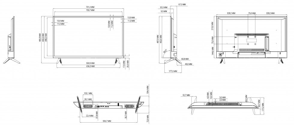 | Габаритные размеры | 731,37×432,61×67,5 мм (без подставки) 731,37×485,9×177,3 мм (с подставкой) |