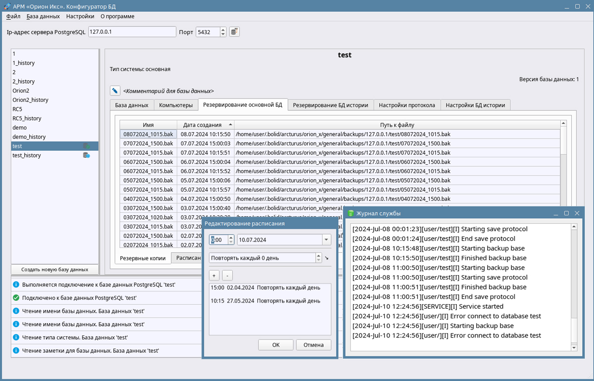Конфигуратор БД предназначен для подключения АРМ «Орион Икс» к базам данных, создания новых БД, модернизации БД при установке новых версий, ручном и автоматическом резервном копировании, поддержании определённого размера основной БД, автоматическом сбросе протокола в БД истории и других действиях с базами данных.