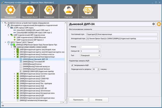 - Предоставлять оператору информацию по объектам системы: вход, выход, адресат, прибор, зона, группа зон, папка, точка доступа