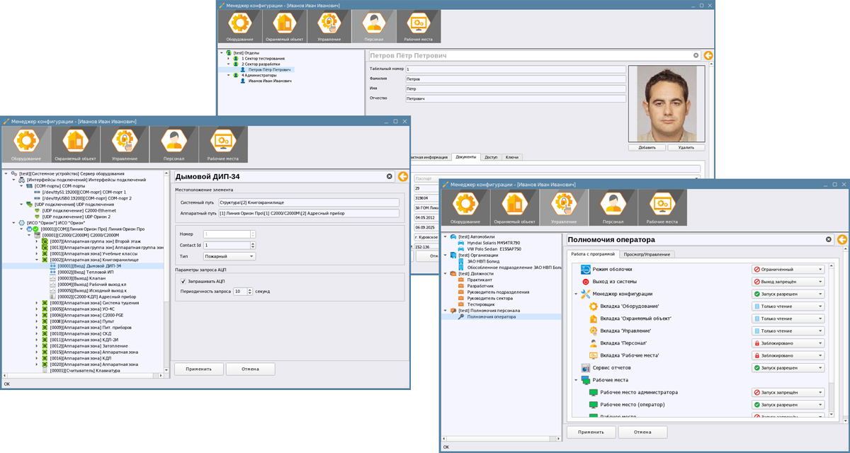 - Настраивать полномочия операторов для работы с системой и права на управление системой сигнализации