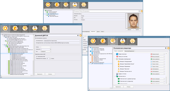 В приложении «Менеджер конфигурации» осуществляется настройка графического интерфейса рабочих мест операторов, где можно создать сразу несколько представлений рабочих мест с произвольно расположенными модулями и распределить их по операторам через настройку прав и полномочий.
