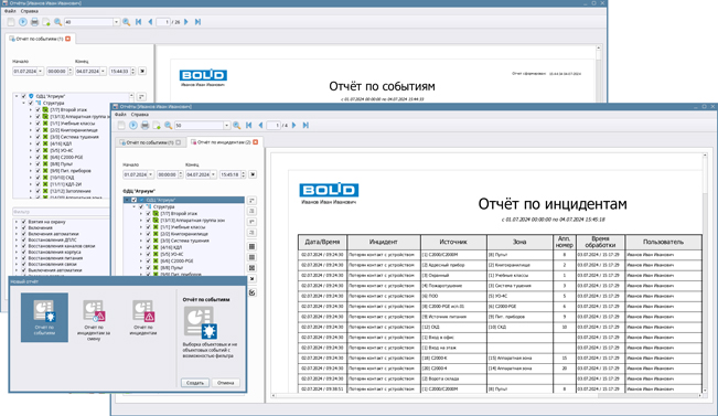 - Предоставление отчётов разной выборки: по событиям, по инцидентам, по инцидентам за смену