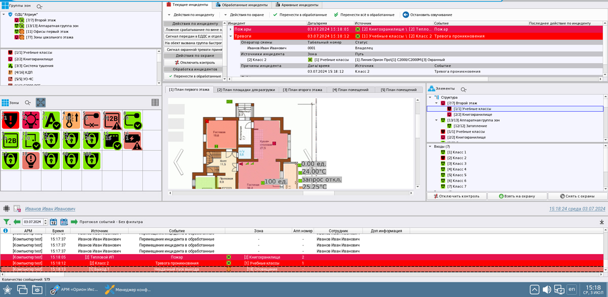 - Вывод тревожных извещений со звуковым сопровождением и алгоритмом обработки в специальных графических модулях – «Инциденты» и «Окно тревожных сообщений»