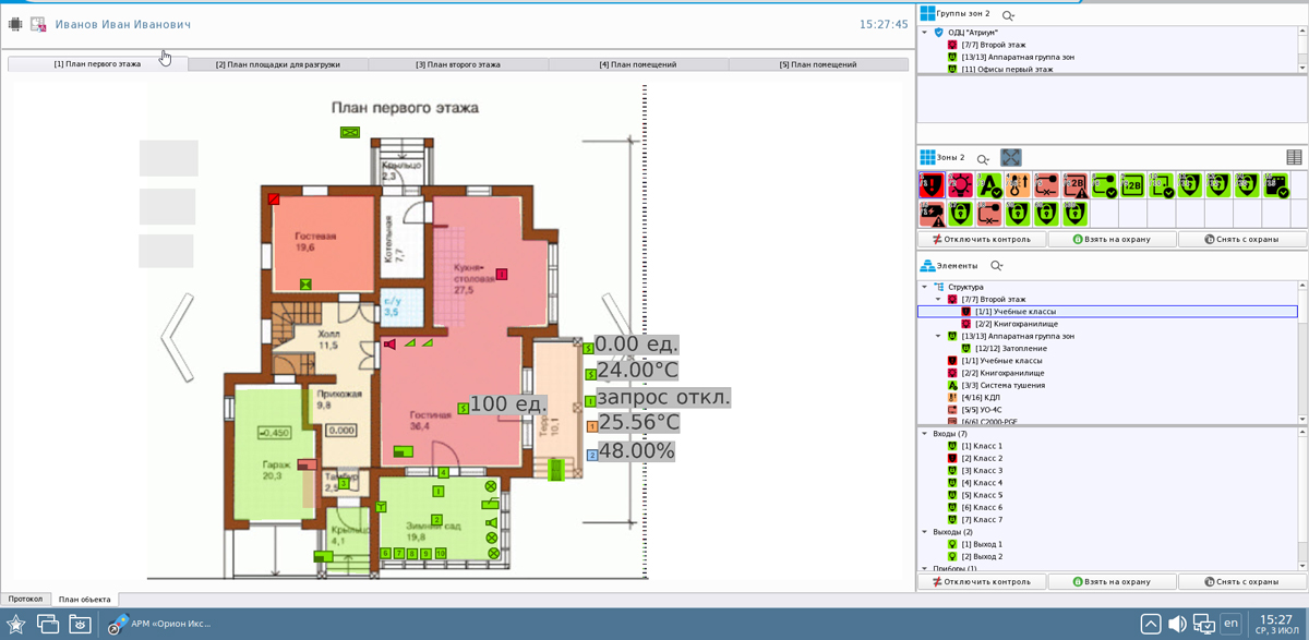 - Управление элементами системы при помощи модулей рабочего места и с помощью интерактивных графических планов помещений