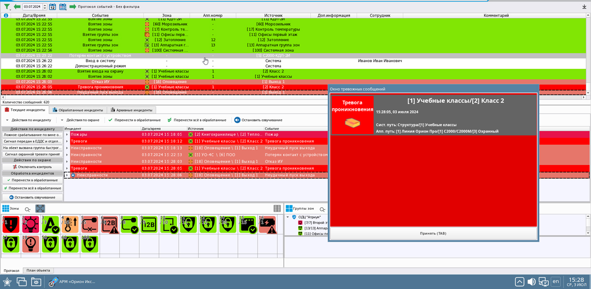 - Отображение тревожных извещений со звуковым оповещением и отслеживанием реакции оператора в специальных графических модулях – «Инциденты» и «Окно тревог»