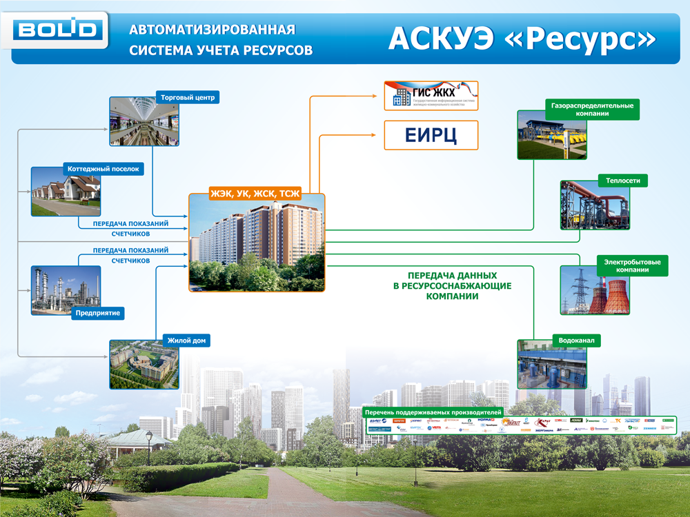АСКУЭ "Ресурс" (Автоматизированная Система Контроля и Учёта Энергоресурсов) – это решение для удаленного автоматизированного сбора показаний приборов учёта ресурсов (воды, газа, тепла, электроэнергии (мощности)). АСКУЭ "Ресурс" от ЗАО НВП "Болид" позволяет хранить, передавать и обрабатывать информацию с приборов учёта ресурсов в режиме реального времени независимо от типа устройства и производителя. Точность передаваемых показаний подтверждена свидетельством об утверждении типа средств измерений (Госреестр №60424-15).