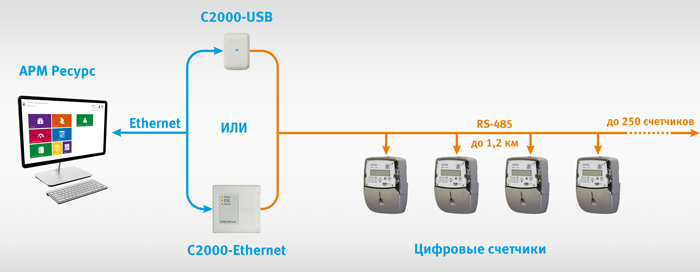 Сбор показаний цифровых счетчиков с интерфейсом RS-485 осуществляется путем подключения счетчиков к COM- или USB-порту компьютера с АРМ "Ресурс" через соответствующий преобразователь интерфейсов ("С2000-ПИ", "С2000-USB" или "USB-RS485"). С помощью преобразователей интерфейсов обеспечивается передача сигналов по линии RS-485. Персональный компьютер с программой АРМ "Ресурс" может быть включен постоянно, или подключаться по мере необходимости.