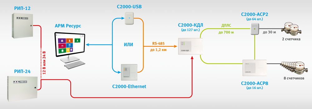 Сбор показаний с импульсных счетчиков организуется с помощью адресных счетчиков расхода "С2000-АСР2" и/или "С2000-АСР8" и контроллера двухпроводной линии связи "С2000-КДЛ". "С2000-АСР2" и "С2000-АСР8" подсчитывают импульсы от счетчиков и по адресной двухпроводной линии связи (ДПЛС) передают данные о расходе на сетевые контролеры "С2000-КДЛ". Последние могут накапливать и хранить показания счетчиков и по запросу ПО АРМ "Ресурс" передавать данные на ПК для обработки и отображения информации. Персональный компьютер с программой АРМ "Ресурс" может быть включен постоянно или подключаться по мере необходимости.
