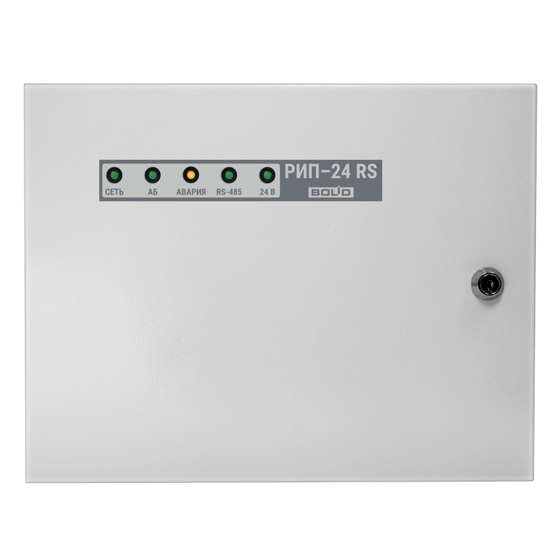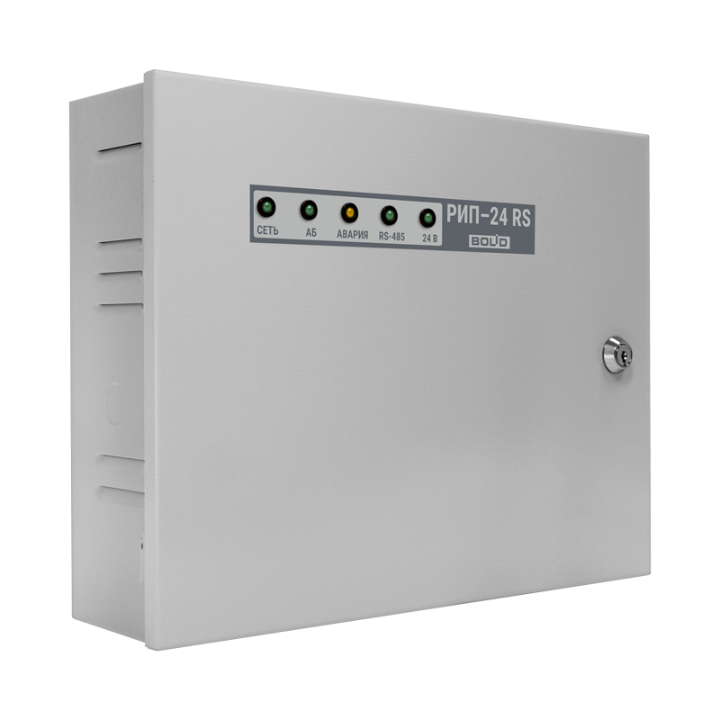 24В; 2А (мах 2.5А); емкость АБ 2*7Ач; световая индикация; звуковая сигнализация; датчик вскрытия корпуса; защита: от перенапряжения, от КЗ, от переполюсовки АБ; интерфейс RS-485.
