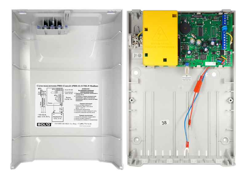 12В; 3А (мах 4А); емкость АБ 17Ач; световая индикация; звуковая сигнализация; датчик вскрытия корпуса; защита: от перенапряжения, от КЗ, от переполюсовки АБ; интерфейс RS-485 (протокол Modbus); пластиковый корпус, не поддерживающий горение.
