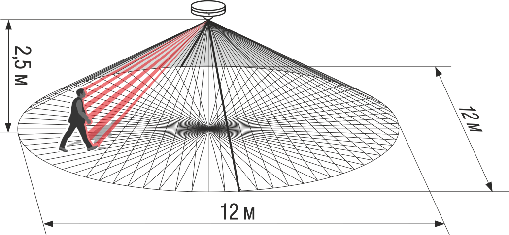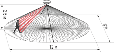 Диаметр зоны обнаружения извещателя (при высоте 2.5м / 3.6м), м12 / 12