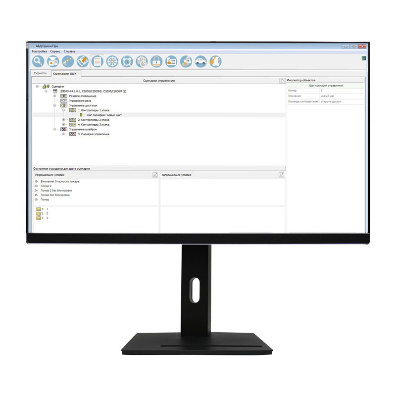 | Программное обеспечение | Монитор Орион Про, Администратор базы данных, Генератор отчетов, Учет рабочего времени - по лицензии на сервере |