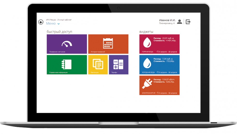 Отображаются показания счетчиков, расход за текущий месяц, стоимость в рублях за текущий месяц по каждому счетчику. Возможна фильтрация по типу ресурса.