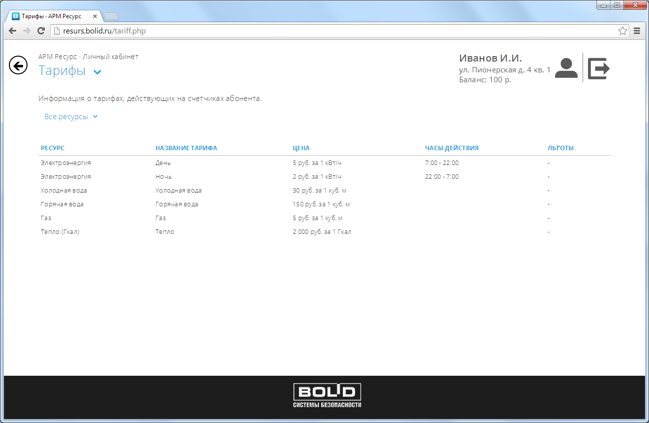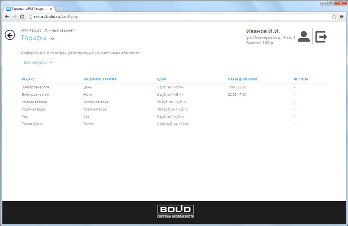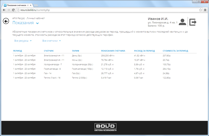 Текущие показания всех счетчиков зарегистрированных в системе. Отображаются: показания счетчиков, расход за текущий месяц, стоимость в рублях за текущий месяц по каждому счетчику. Возможна фильтрация по типу ресурса.p>