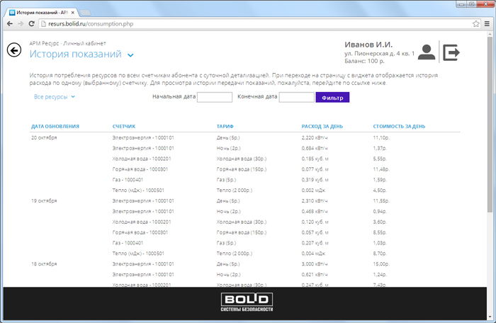 История потребления ресурсов по всем зарегистрированным в системе счетчикам с суточной детализацией и указанием владельца счетчика. Фильтрация данных с помощью календаря и по типу ресурса.