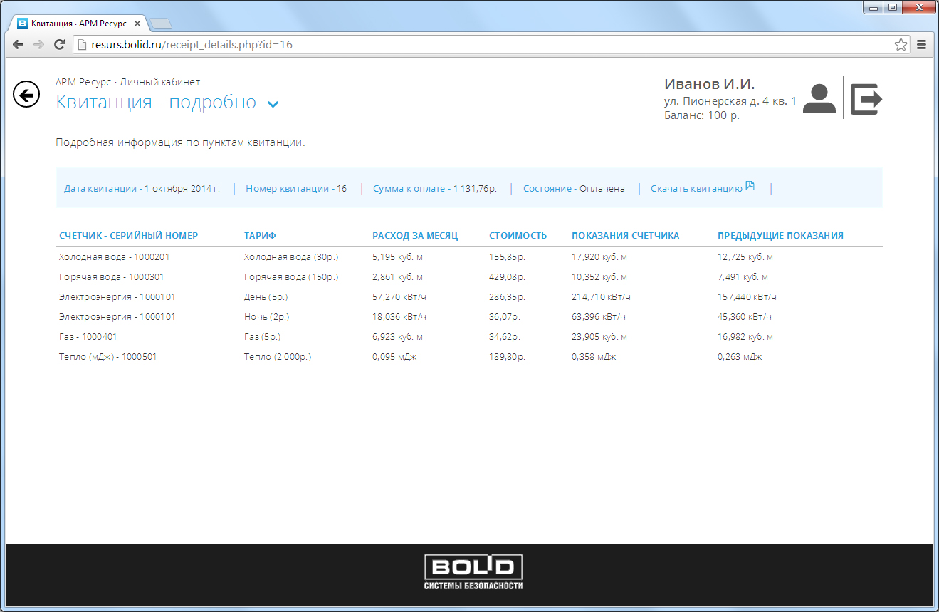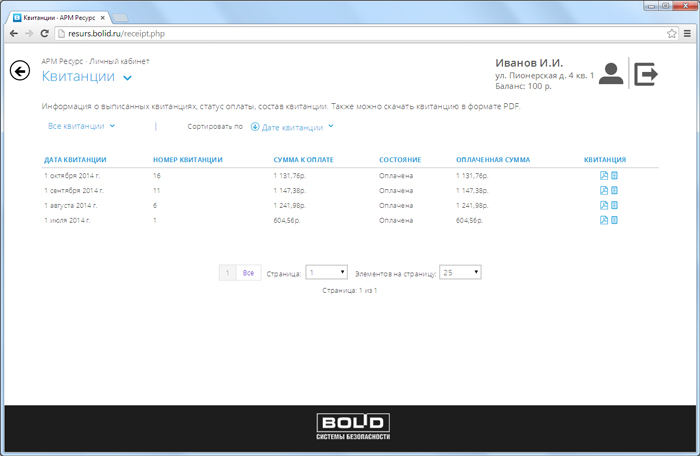 Информация о выписанных квитанциях, статус оплаты, состав квитанции. Возможность скачивания квитанций в формате PDF. Оплата онлайн с помощью банковской карты.