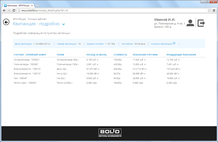 Подробная информация по пунктам квитанции. Потребление за месяц по каждому счетчику, стоимость согласно тарифному плану, показания на момент формирования квитанции и показания в начале периода.