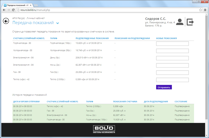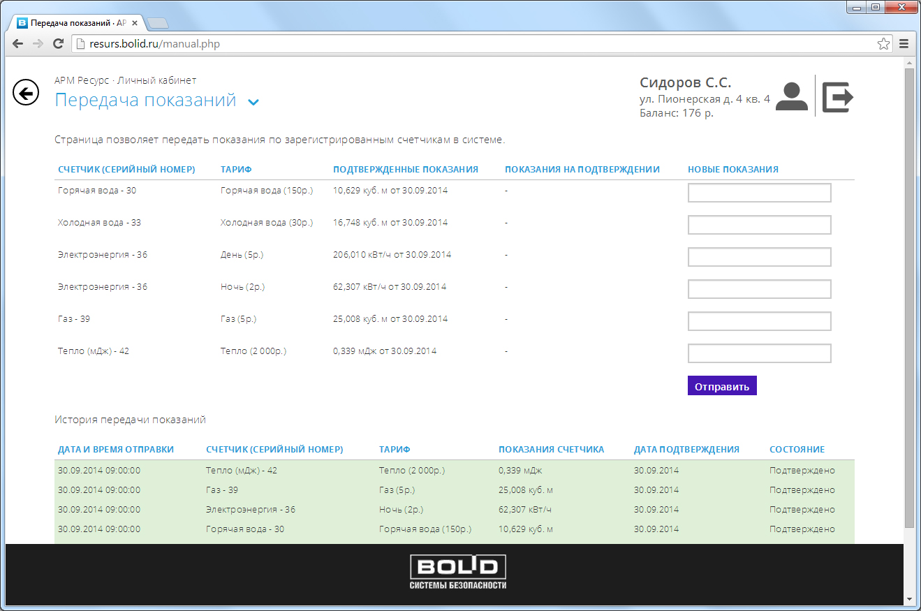 Страница позволяет передать абоненту показания по зарегистрированным счетчикам в системе. При отправке видно ранее отправленные показания и их статус.