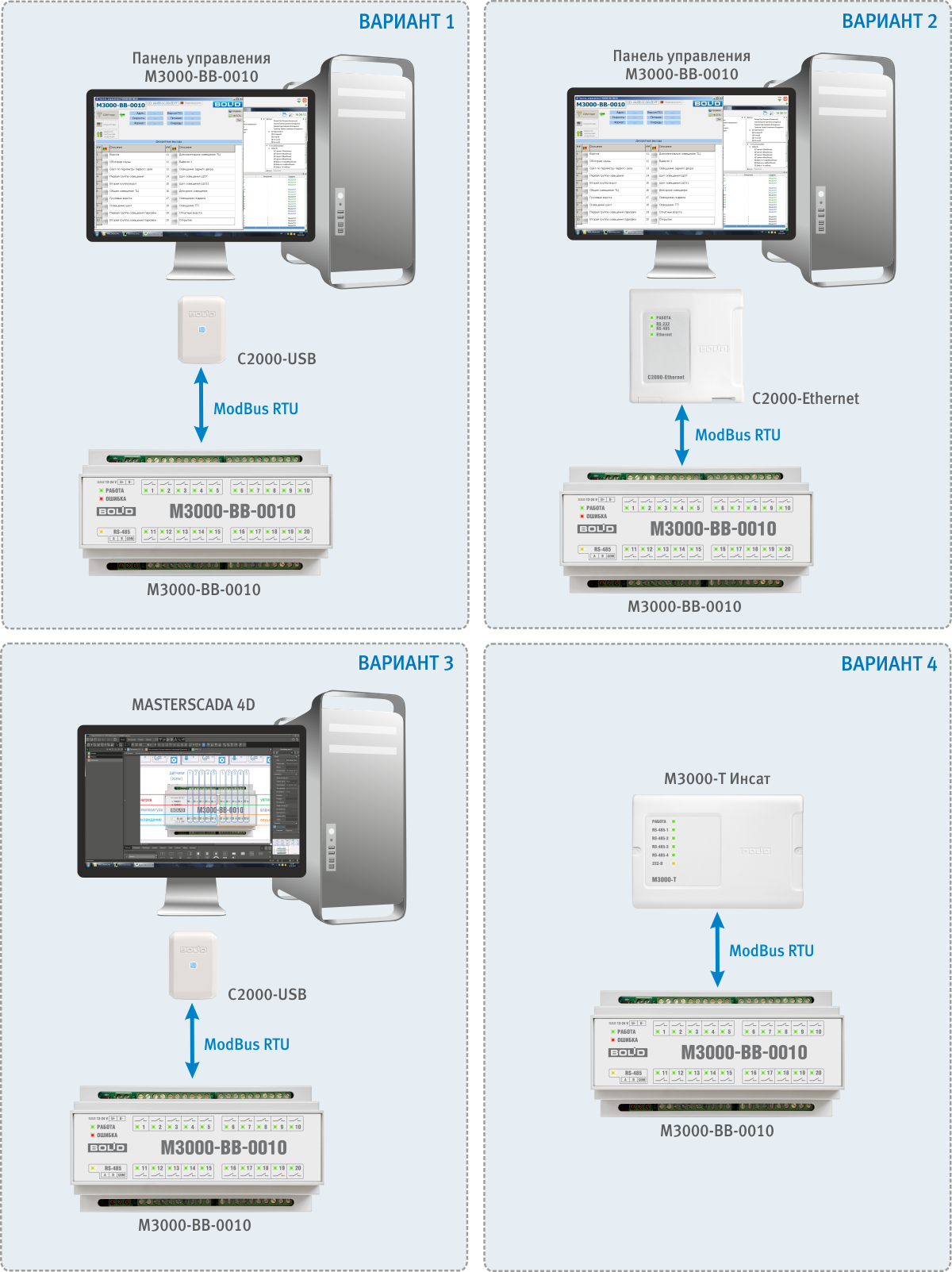 Вариант 1 следует рассматривать как начальный этап работы с прибором. Всё, что необходимо пользователю, чтобы приступить к работе – это ПК с подключенным к нему преобразователем интерфейсов (в данном случае С2000-USB) и любая программа, способная формировать и отправлять в COM-порт запросы и принимать ответы в протоколе ModBus RTU. Это может быть как самостоятельно разработанное отладочное пользовательское приложение, так и широко представленные в интернете программы типа ModBusTESTER. Компания «БОЛИД» для упрощения работы с прибором предлагает воспользоваться приложением «Панель управления М3000-ВВ-0010», позволяющим максимально упростить взаимодействие пользователя с прибором. Программу целесообразно использовать для ознакомления с прибором, как вспомогательное средство для ознакомления с прибором, при ручном управлении и при пуско-наладочных работах. Если по каким-либо причинам производится доработка проекта в СКАДА-системе, то эта программа позволит провести ручное манипулирование нагрузками «по временной схеме» до готовности рабочего проекта. Кроме того, программа позволяет проследить процесс обмена пакетами прибора с ведущим прибором по протоколу ModBus RTU, что может существенно облегчить процесс настройки ОПС-сервера.