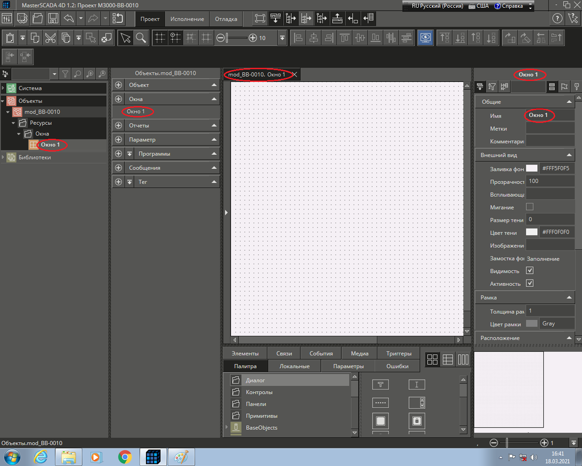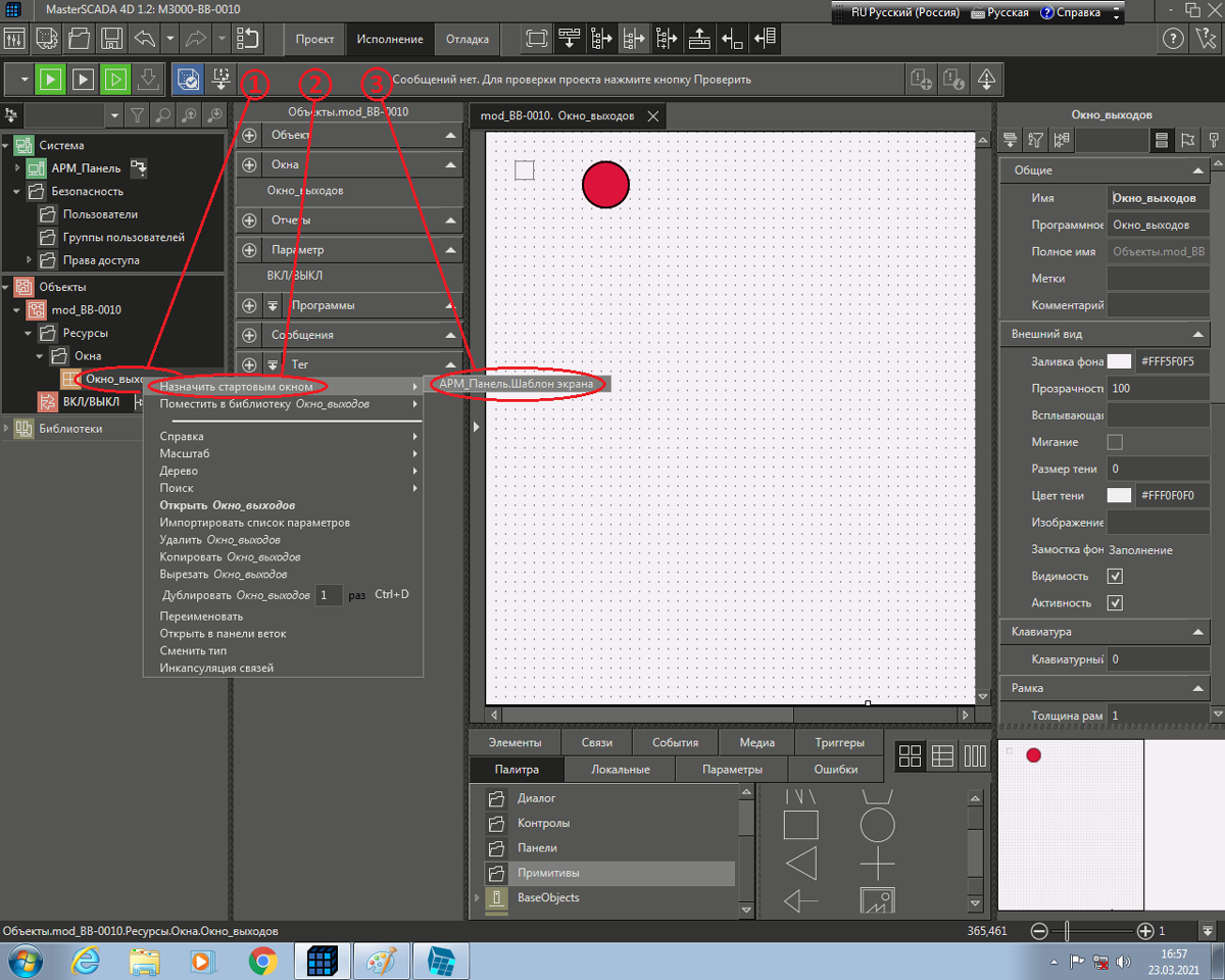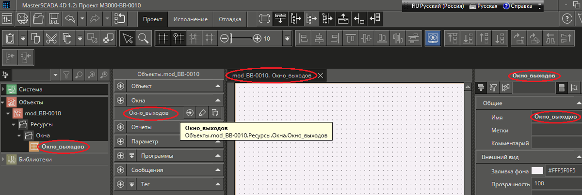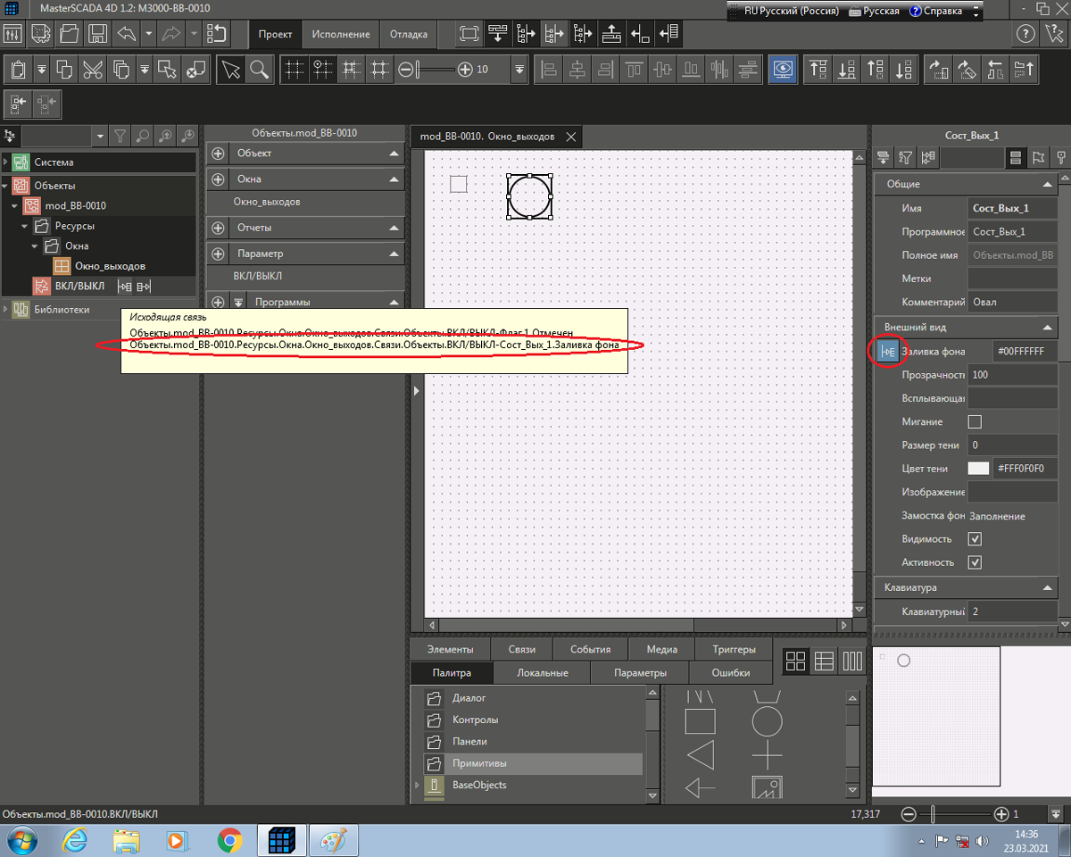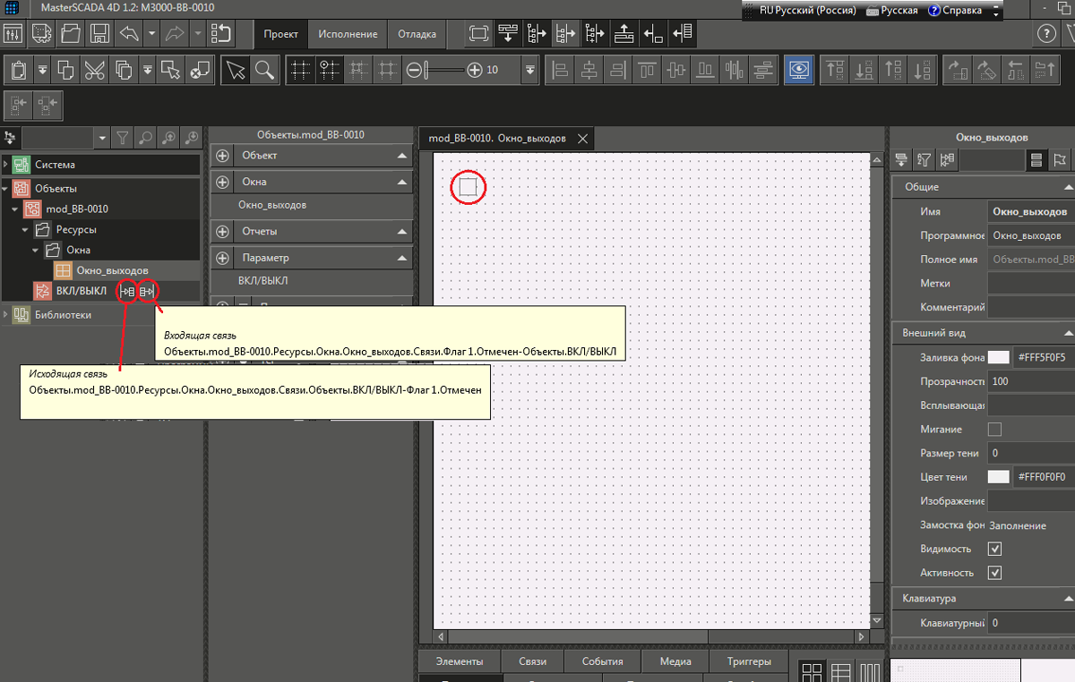 Рис. 19 Окно среды разработки после «привязки» свойства «Заливка фона» графического примитива с именем «Сост_Вых_1» окна «Окно_выходов» к параметру ВКЛ/ВЫКЛ объекта «mod_BB-0010».