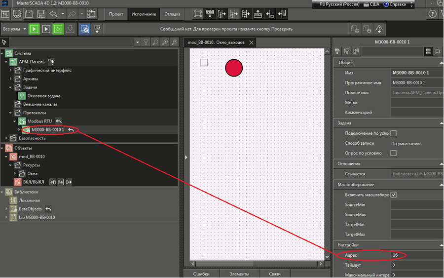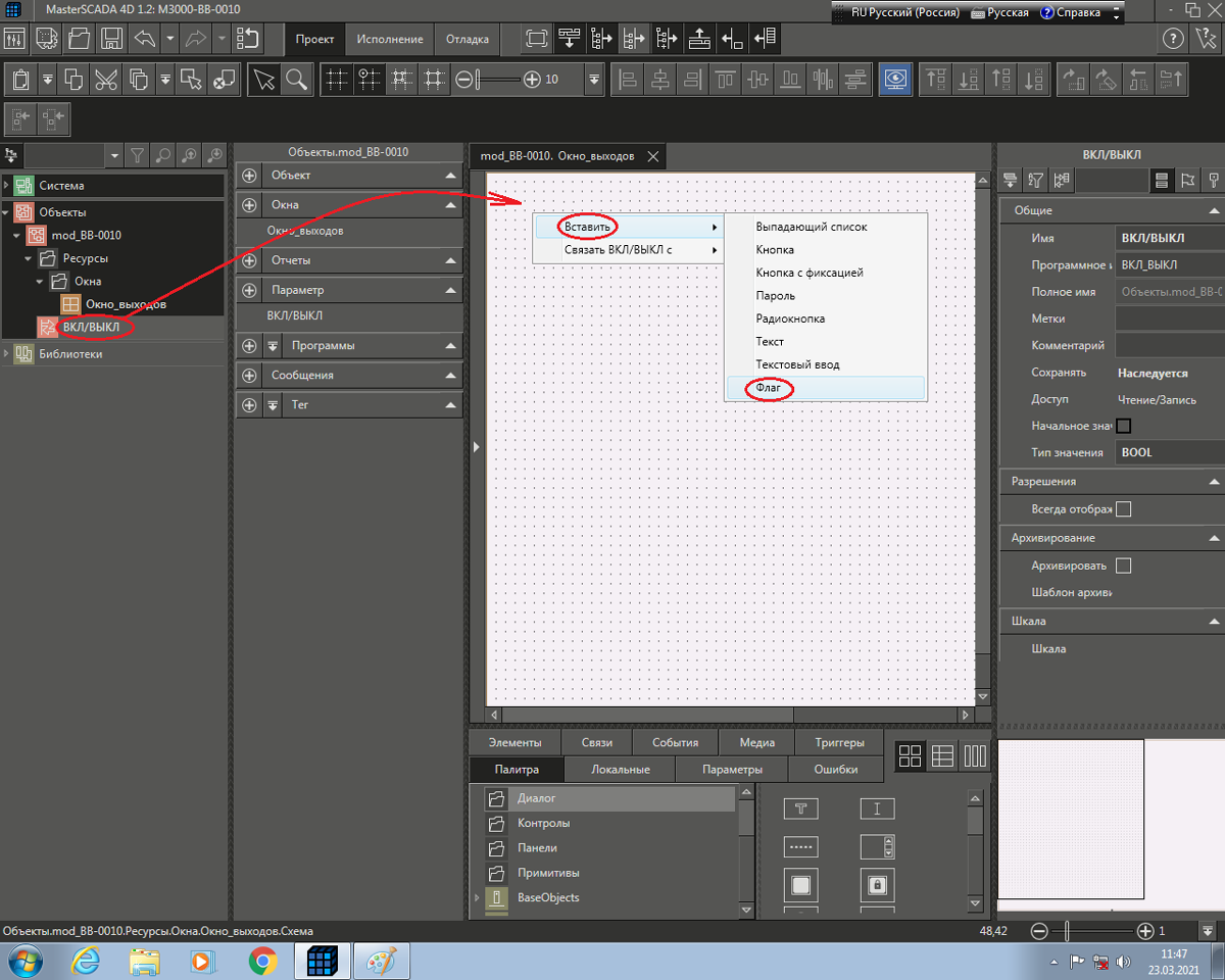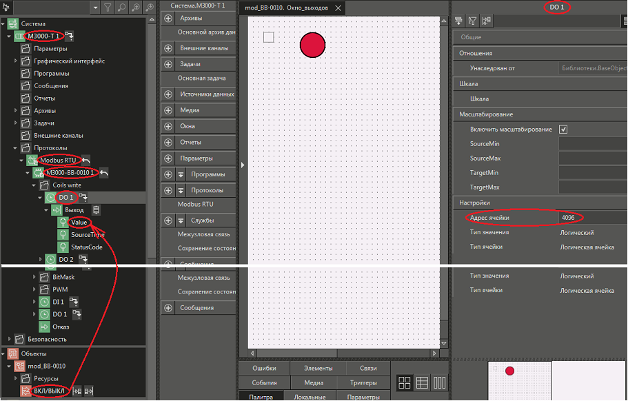 Рис. 42. Среда разработки и последовательность действий по «связыванию» параметра ВКЛ/ВЫКЛ объекта mod_BB-0010 Value
