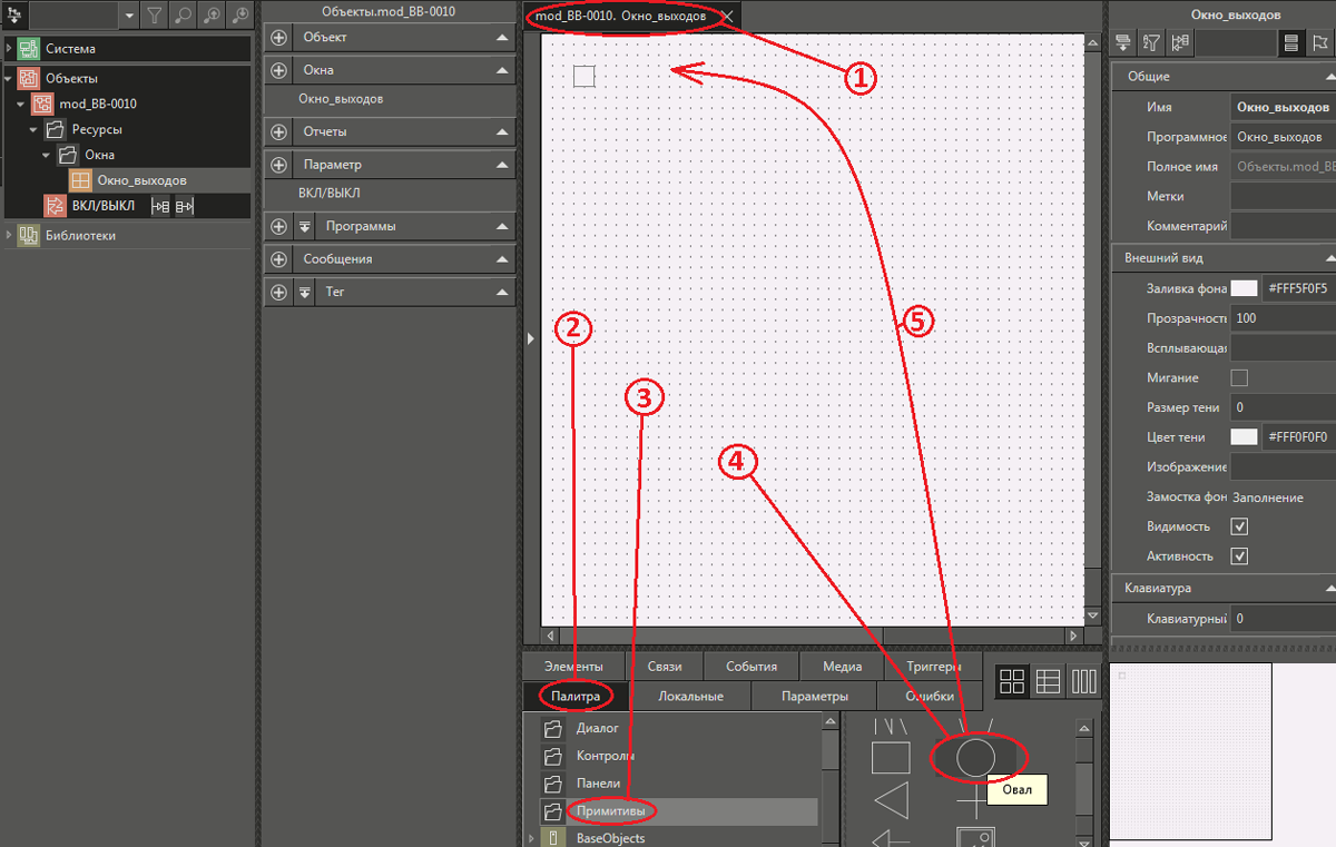 Таким образом, если входной параметр «Заливка фона» графического примитива с именем «Сост_Вых_1» , который в свою очередь «привязан» к параметру «ВКЛ/ВЫКЛ» объекта «mod_BB-0010», соответствующему состоянию флага в окне Окно_выходов, равен False, то примитив приобретает серый цвет (точнее DarkGray), а если True, то – красный (точнее Crimson).