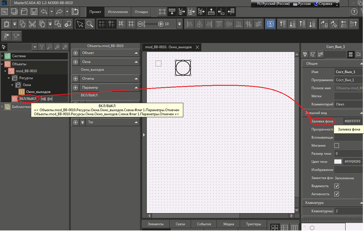 Рис. 18 «Привязка» свойства «Заливка фона» графического примитива с именем «Сост_Вых_1» к параметру ВКЛ/ВЫКЛ объекта «mod_BB-0010».