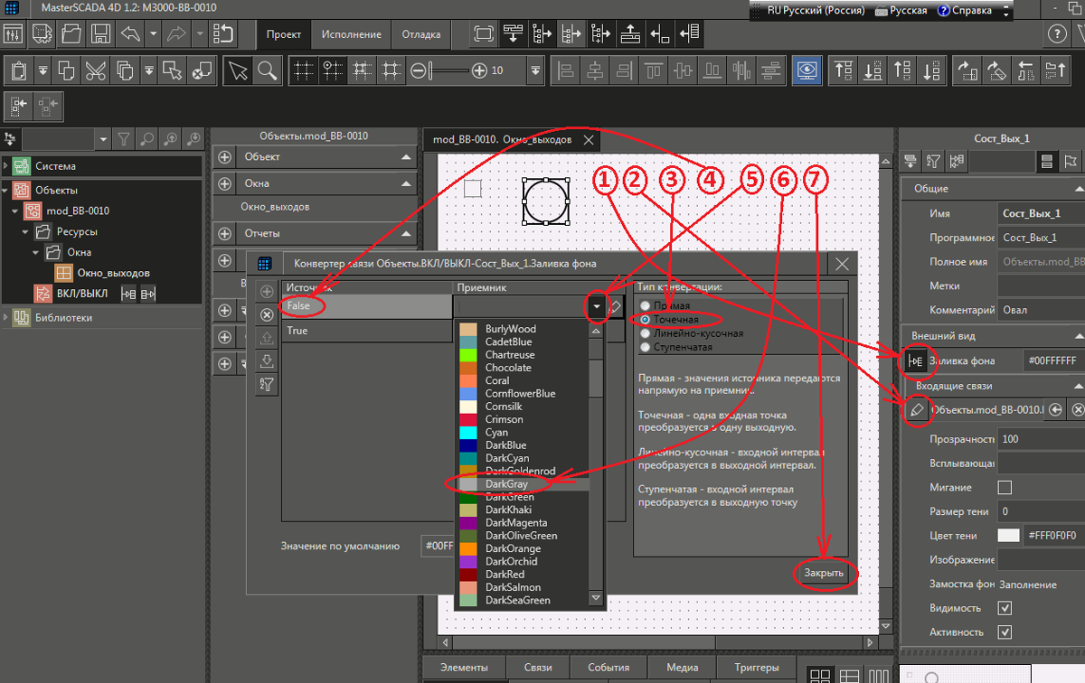 Рис. 20 Диалог и последовательность действий по привязке параметра «ВКЛ/ВЫКЛ» объекта «mod_BB-0010» к свойству «Заливка фона» графического примитива с именем «Сост_Вых_1» при помощи Конвертора связей