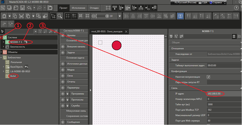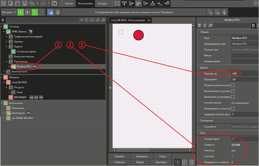 Рис. 40. Среда разработки и последовательность действий по указанию порта и его настроек контроллеру М3000-Т в протоколе ModBus RTU.