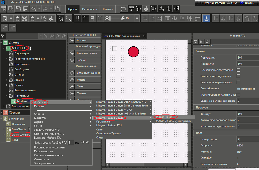 Рис. 41. Среда разработки и последовательность действий по добавлению в проект контроллеру М3000-Т в протоколе ModBus RTU ведомого модуля М3000-ВВ-0010.