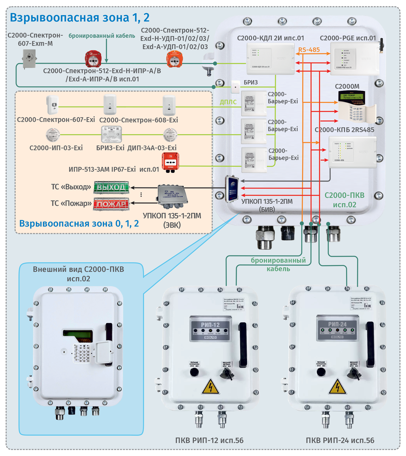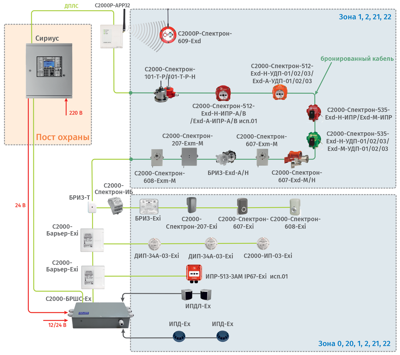 Если на объекте с адресно-аналоговой системой пожарной сигнализации на основе контроллера «С2000-КДЛ» имеются взрывоопасные зоны (помещения или открытые площадки с наличием взрывоопасных веществ, газов, газовоздушных, парогазовых смесей, пыли или пылевоздушных смесей), то в таких зонах следует применять только взрывозащищенные адресные извещатели.